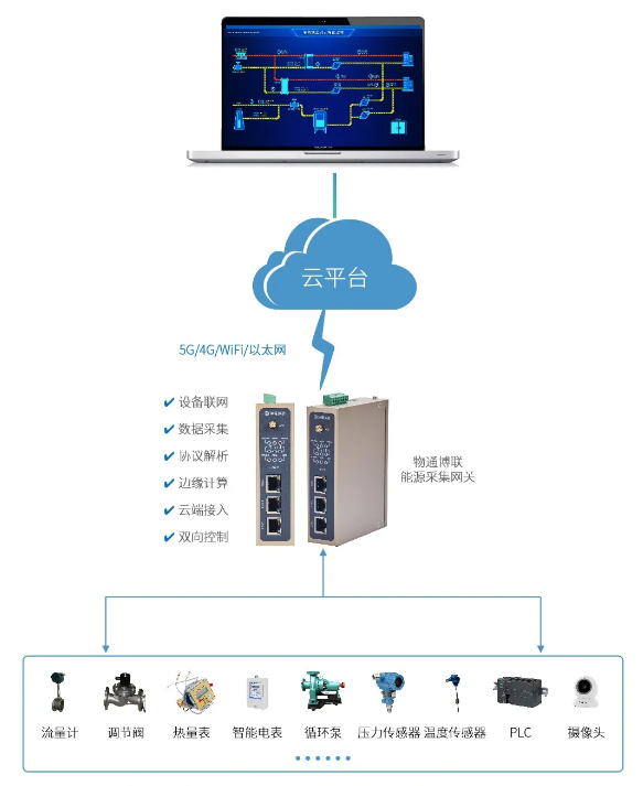 通過部署能源數(shù)采網(wǎng)關(guān),能夠?qū)崟r采集流量計(jì)、智能電表、熱量表、稱重儀器、循環(huán)泵、調(diào)節(jié)閥、溫度傳感器、壓力傳感器等設(shè)備,將供熱量、耗汽量、耗水量、耗電量、燃料消耗量、余熱利用量、溫度、壓力等數(shù)據(jù)對接到智慧供熱能源管理平臺中,從而將熱源、管網(wǎng)、中繼泵站、熱力站等納入統(tǒng)一的節(jié)能評價(jià)系統(tǒng)中,實(shí)現(xiàn)對能源的監(jiān)測、管理、統(tǒng)計(jì)與分析,助力提高能源利用效率與管理水平,實(shí)現(xiàn)節(jié)能、降本與增效的全面發(fā)展。