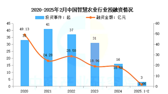 近年來,中國智慧農業(yè)行業(yè)投資事件數(shù)量及規(guī)模整體呈波動上升趨勢。IT桔子數(shù)據(jù)顯示,2024年我國智慧農業(yè)投資數(shù)量16起,已披露融資金額達18.59億元。2025年1-2月我國智慧農業(yè)投資數(shù)量3起,已披露融資金額達1.66億元。
