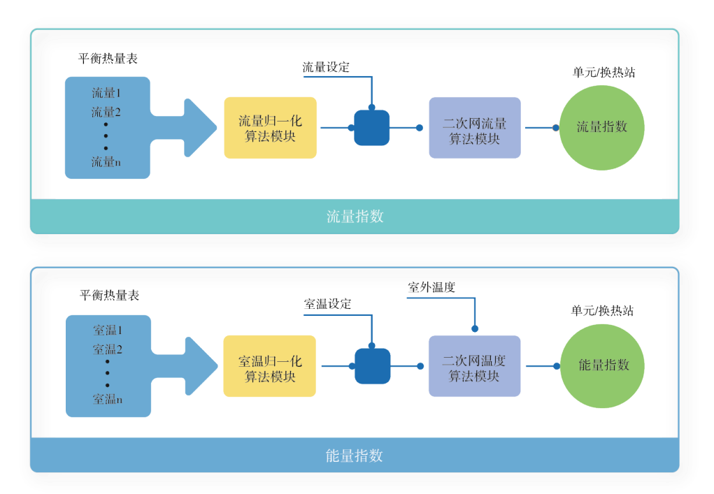 換熱站的流量指數(shù)由各熱用戶(hù)的流量加權(quán)平均而成,并進(jìn)行歸一化處理。流量指數(shù)作為二級(jí)網(wǎng)循環(huán)量閉環(huán)控制反饋信號(hào),實(shí)現(xiàn)水力的精準(zhǔn)調(diào)控,降低循環(huán)水泵電力消耗。采用具備室溫軟測(cè)量算法的平衡熱量表作為熱用戶(hù)的智控終端,能量指數(shù)由各熱用戶(hù)的室溫軟測(cè)量數(shù)據(jù)加權(quán)平均而成,并做歸一化處理。換熱站的能量指數(shù)進(jìn)一步向熱源端反饋熱量需求,標(biāo)準(zhǔn)化的能量指數(shù)使得熱源端能根據(jù)各個(gè)換熱站的能量需求情況統(tǒng)一分配熱能給各個(gè)換熱站,實(shí)現(xiàn)熱源的精準(zhǔn)調(diào)控。采用以能量指數(shù)為核心的熱能分配體系,熱源可以充分利用供熱系統(tǒng)的熱惰性最大限度地考慮電力系統(tǒng)的負(fù)荷特性,采取主動(dòng)削峰等技術(shù)手段,降低電力系統(tǒng)的容量投資。